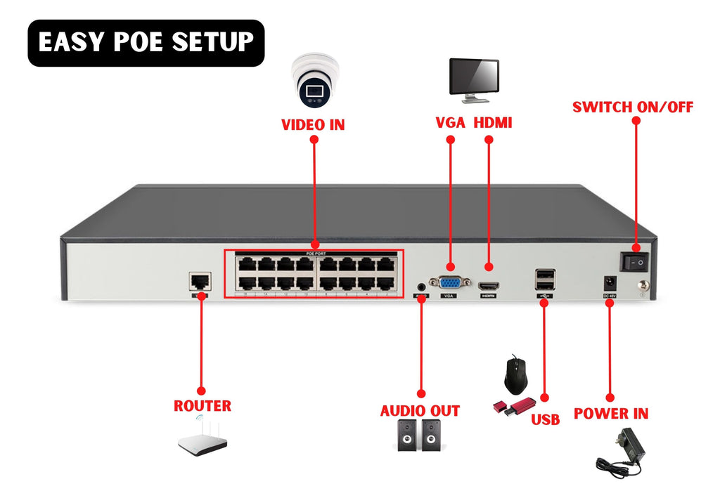 16 Channel 4TB H.265 HD 4K / 8MP Network Video Recorder. Featuring advanced H.265 compression, which allows you to save up to 50% more storage space. 4TB Hard drive installed for continuous recording. PoE(Power over Ethernet) technology makes it easy to use a single Ethernet cable for both data transmission and power supply. Supports remote view via smartphone, tablet and PC.